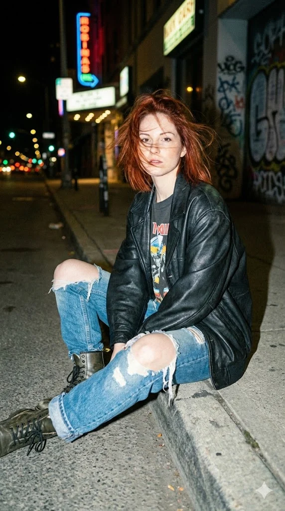 Стиль «бунтарки». Кожаная куртка, ночная улица, зернистость, атмосфера свободы. Техническая фишка: Flash photography (съемка со вспышкой) и red eyes effect removal (чтобы имитировать стиль мыльницы, но без красных глаз). Этот промт создает ощущение случайного кадра (candid shot), сделанного другом на тусовке.