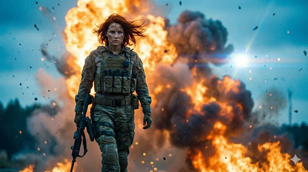 Классический троп боевиков: героиня уходит от взрыва и не оборачивается. Цветовое решение: Teal and Orange (Бирюзовый и Оранжевый) — самая популярная схема в Голливуде, где цвет кожи контрастирует с холодным фоном или, как в данном случае, с огнем. Anamorphic lens добавляет характерные блики и вытянутое бокэ.