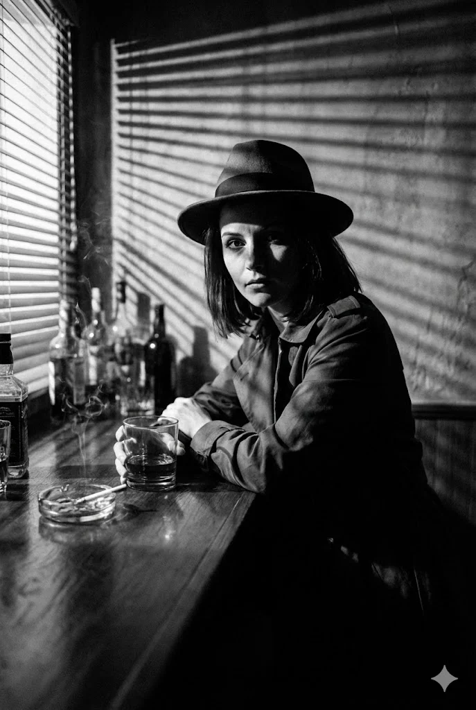 Черно-белая эстетика, игра теней (chiaroscuro), дым. Атмосфера: Мы используем токен venetian blind shadows (тени от жалюзи), чтобы создать классический паттерн на стене или лице, характерный для нуарных фильмов 40-х годов. Это добавляет загадочности и напряжения.