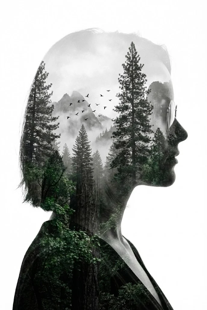 Сложный художественный прием, объединяющий силуэт и пейзаж. Раньше это делали в Photoshop, теперь нейросеть справляется за секунды. Композиция: Важно указать white background (белый фон), чтобы силуэт читался четко и не сливался с окружением.