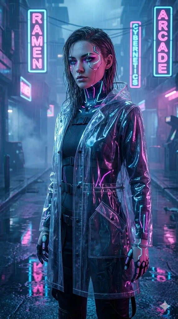 Футуристичный образ, идеален для аватарок, игровых каналов или концепт-арта. Освещение: Здесь работает схема с двумя источниками света разного цвета (blue and pink lighting scheme). Volumetric fog (объемный туман) рассеивает свет от неоновых вывесок, создавая глубину сцены.