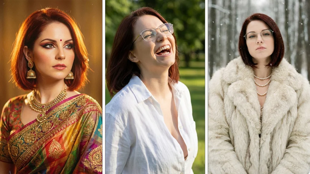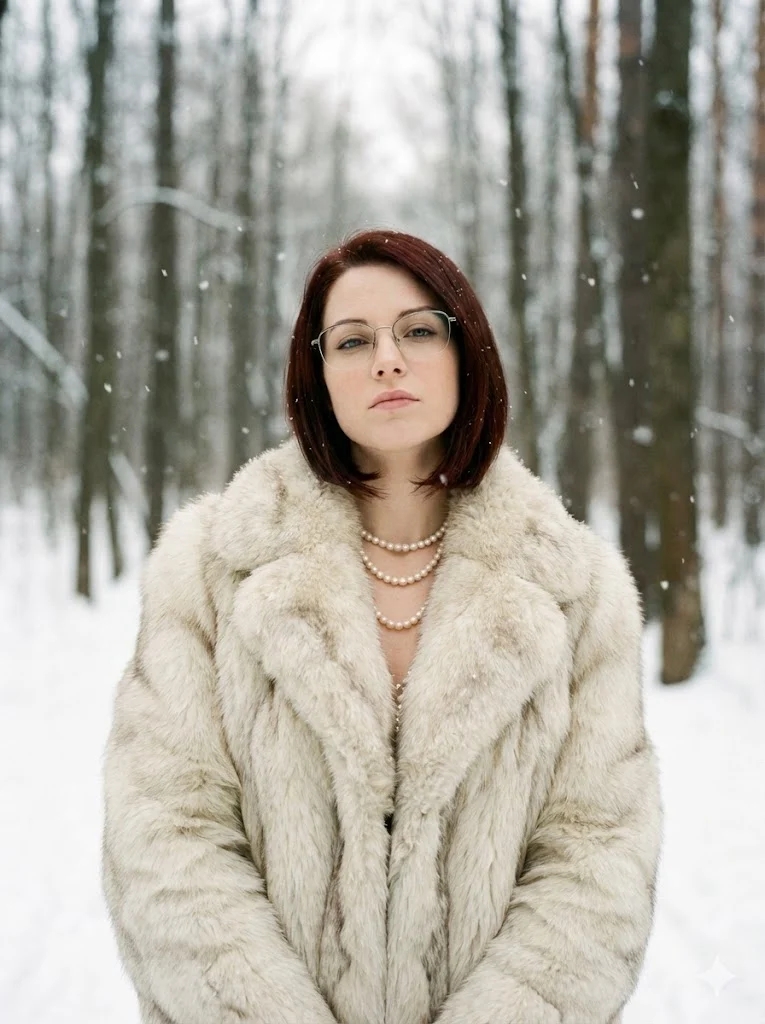 Почему этот промт работает: Мы используем комбинацию bulky white natural fur coat для создания мощного силуэта и skin pores visible, чтобы лицо не терялось на фоне меха. Haughty expression (надменное выражение) задает правильное настроение для люкс-сегмента.