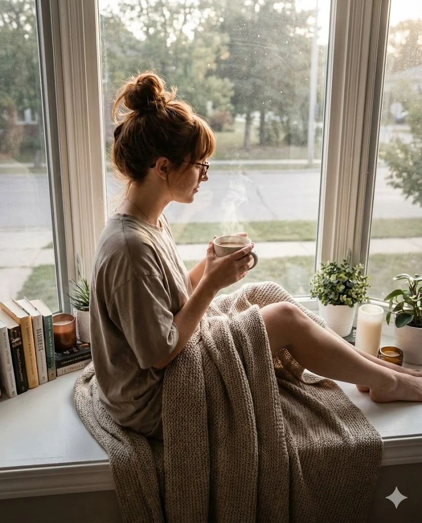Уют, дом, спокойствие. Стиль Hygge. Атмосфера: Steam rising from cup (пар от чашки) добавляет динамики в статичный кадр. Messy bun hairstyle (небрежный пучок) подчеркивает расслабленность момента, в отличие от идеальной укладки.