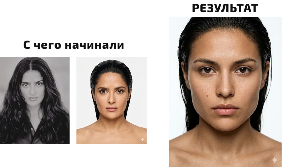 нейромодель на базе фото Сальмы Хайек в молодости, обработка цветной фото Face ID до и после