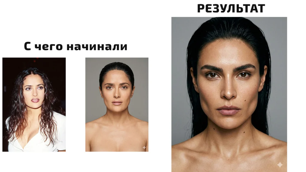 На выходе он даст подробный промт для следующего шага — генерация вашего уникального Face ID для AI-модели. Ниже приведены фотографии из первого варианта, и из второго. При желании промт можно немного подкорректировать, я указал что моей AI-модели 25 лет, и она напоминает мексиканку, чтобы отойти от жесткой привязки к Сальме Хайек.
