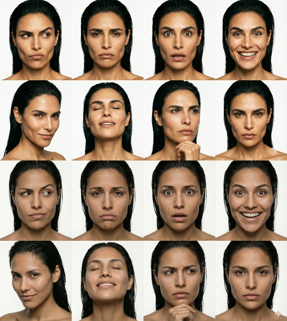 Этот лист используется не только для фото-генераций, но и является золотым стандартом для обучения видео-нейросетей (Hedra, LivePortrait, Kling). Имея такой лист, вы сможете заставить своего персонажа говорить, смеяться или плакать в видео, не теряя узнаваемости.