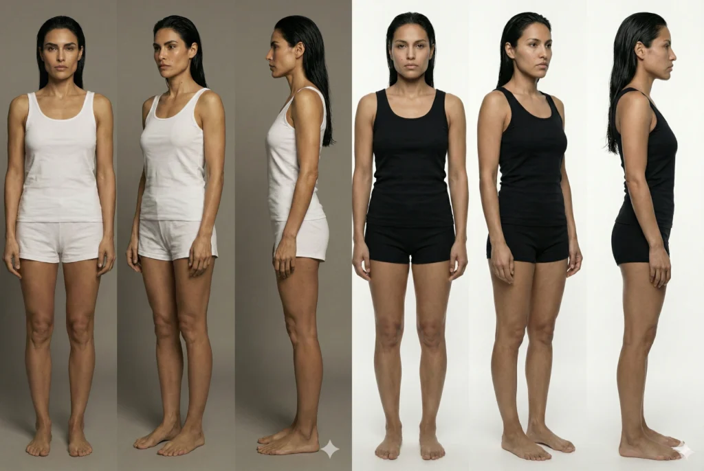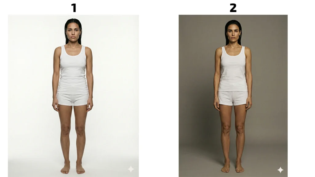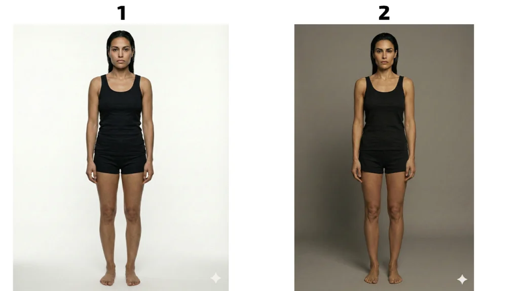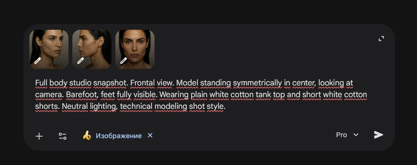 Лицо — это лишь 50% успеха. Инфлюенсер должен носить одежду, позировать в полный рост. Нам нужно зафиксировать тип фигуры (Body ID): рост, пропорции ног, ширину плеч. Для этого мы делаем «снепшоты» — технические фото, которые используют модельные агентства.