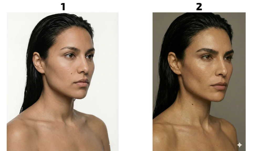 Сценарий Б: У вас есть обычное цветное фото Даже если фото цветное, оно может быть «грязным» для AI: сложный фон, волосы, падающие на лицо, одежда с ярким принтом. Наша задача — убрать весь «визуальный шум» и выставить нейтральный свет (softbox), чтобы ничто не отвлекало алгоритмы от анализа геометрии лица.
