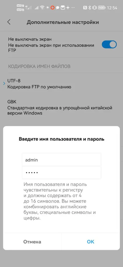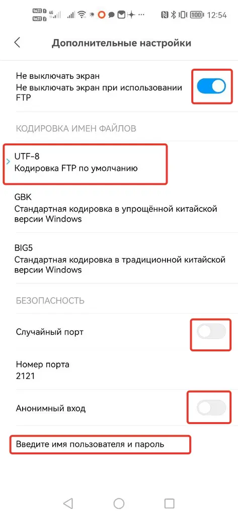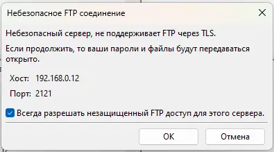 - Хост: Введите FTP-адрес, который вы получили на телефоне (например, `192.168.0.12`).