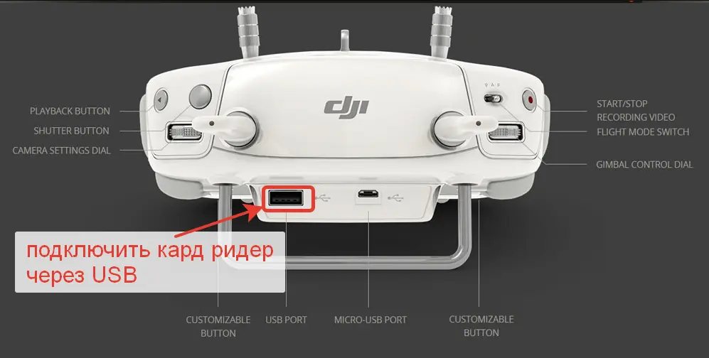 Способ прошивки пульта через кард ридер, очень протой. Необходимо подключить сам кард ридер к коптеру, затем вставить в кард ридер карту microSD с уже загруженной в корневой каталог прошивкой.